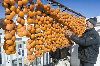 12月4日,河南栾川县石庙镇杨树坪村一位村民在房前晾晒红柿子。每到冬季,地处河南省伏牛山区河南栾川县农民把收摘的柿子挂在房前屋后晾晒,成为山乡农家独特的丰收美景。