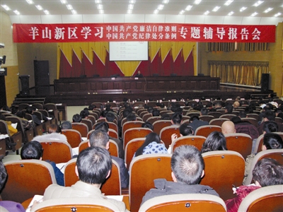 12月25日下午,羊山新区邀请了市委党校党建教研部副主任郑乃红教授做《中国共产党廉洁自律准则》和《中国共产党纪律处分条例》专题辅导报告会。报告会后,参会党员还统一进行了学习《准则》和《条例》闭卷测试。周敬杰 田厚琴 摄