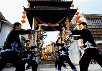 2015年12月31日,湖南省张家界武陵源溪布老街举行非遗展演迎新年活动,民间艺人在街区表演土家族的传统舞蹈八宝铜铃舞等非遗项目,庆祝新年到来,喜接八方游客。新华社发(吴勇兵 摄)