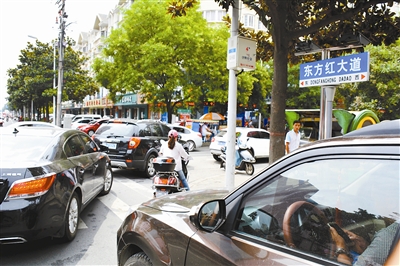 10点起,记者重走上述路线,交通拥堵明显缓解,只有和美超市前东方红大道上因为顾客进场停车排出长队。东方红大道作为我市公认的堵车第一街,在每一个十字路口,甚至每一处行人过街口都存在堵车现象。