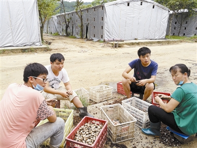 新县各乡镇的龙头种植养殖基地,不仅帮助困难群众脱贫致富,而且成为高校学生实习、创业的热土。图为日前来自我省西部地区的高校学生利用暑假在郭家河乡食用菌种植基地实习,学习食用菌的栽培技术,为毕业后创业就业打下基础。 本报记者 张 勇 摄