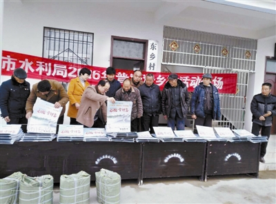 | “坐在家中,每天看日历都能学到法律知识。”12月20日,淮滨县栏杆镇东乡村的村民陈玉涛接过普法日历画册后说。为全面落实“七五”普法规划,市水利局在对口扶贫村开展以“脱贫攻坚,与法相伴,水利先行”为主题的送法入农户活动,以漫画日历的形式普及涉水法律知识,提倡节约、安全用水。当天共送发宣传日历400余册。 本报记者 郭靖 摄 |