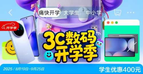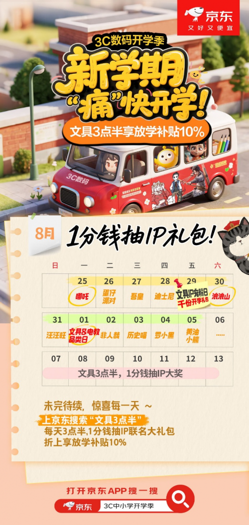 想要以崭新的面貌迎接新学期的到来,换新优质装备不可或缺。京东站内的3C数码开学季也带来了海量数码、文具好物,让消费者一键购齐所需,打开京东APP搜索“痛快开学”即可直达活动会场,部分地区的用户可享国家补贴优惠,下单立减15%起,学生用户还能叠加教育优惠至高可省4000元,权益丰厚。8月25日至9月5日期间,每天下午3点半打开京东APP搜“3C中小学开学季”还能参与1分钱抽IP礼包活动,《哪吒》、《浪浪山》、迪士尼等人气IP联名大礼包均有机会1分钱带回家;同一时刻京东还将准时发放放学补贴,下单文具立减10%到手更划算;此外8月29日京东还将开启IP宠粉日,千份开学礼包大放送,为用户带来又好又便宜的购物体验。