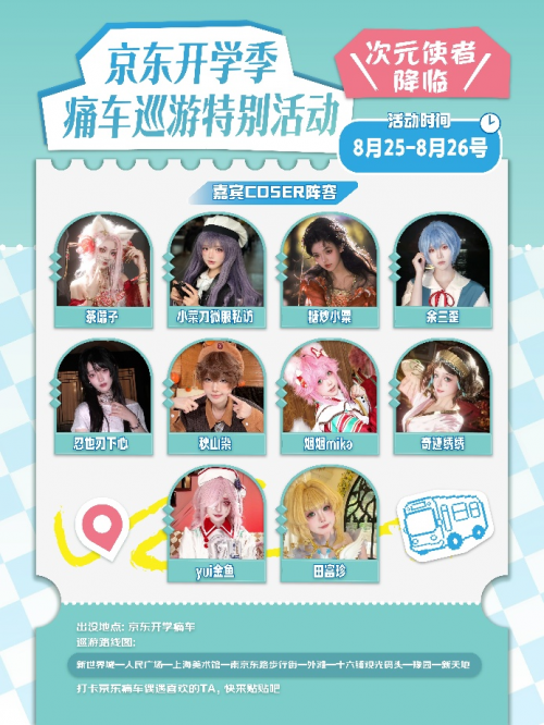 值得一提的是,在8月25日、26日期间,京东还邀请了茶蘼子、小菜刀微服私访、糖炒小栗等10位知名coser一同参与痛车巡游,想要与coser合影集邮的朋友记得抓住机会。用户在巡游开始前15分钟到达出发站点,与工作人员对暗号“痛快开学上京东”即可上车,随后按工作人员指引完成小红书或微博打卡,即可领取内含纪念票根、开学必备装备、随机掉落惊喜谷子在内的开学礼包。