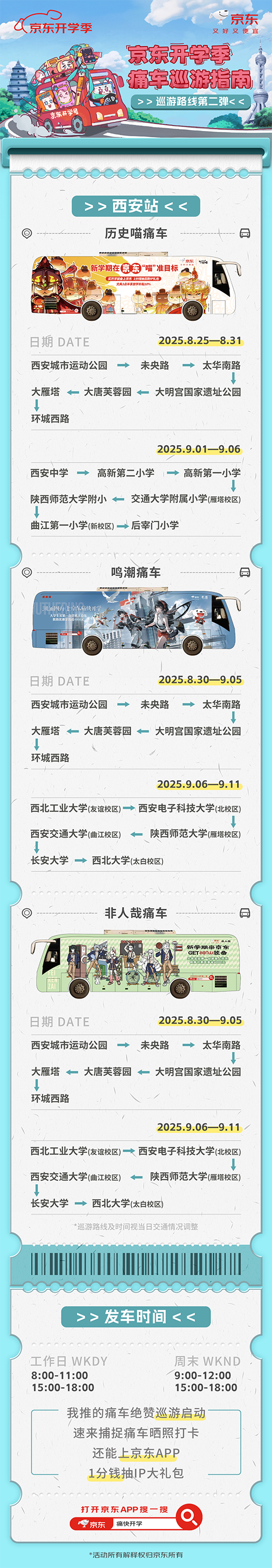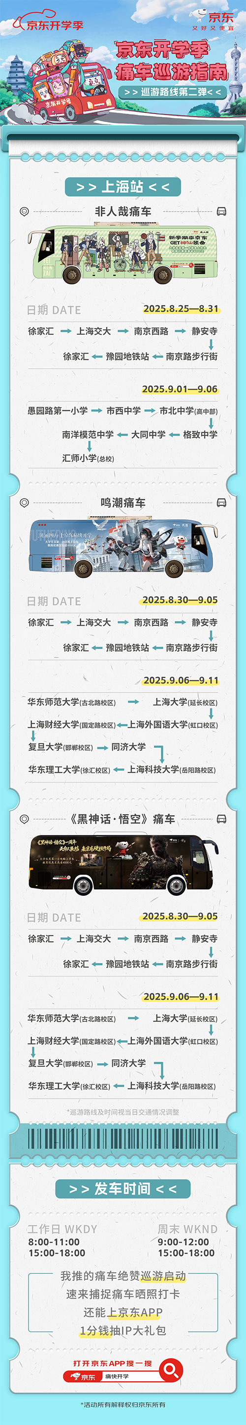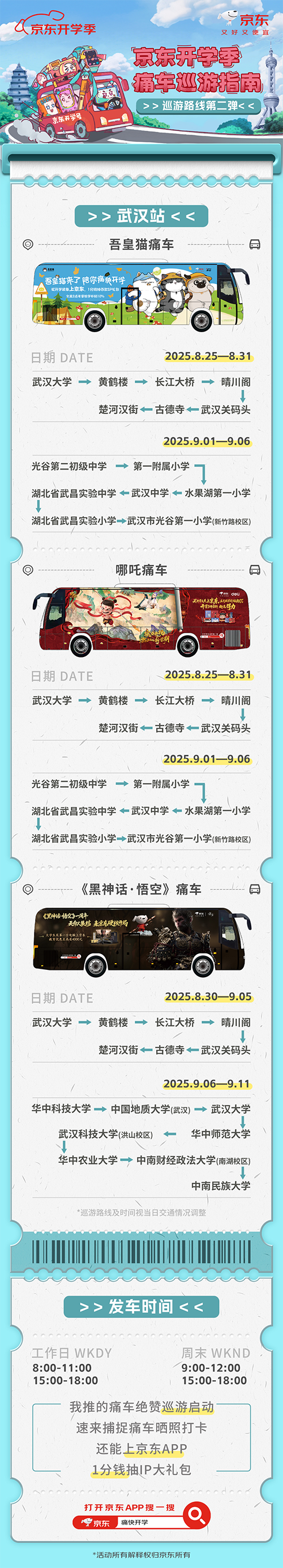 京东痛车巡游活动第二弹将于上海、武汉、西安三城启动。从8月25日至9月6日,上海将有《非人哉》痛车巡游,武汉有《吾皇猫》、《哪吒之魔童降世》痛车巡游,西安则有《如果历史是一群喵》痛车巡游;而在8月30日至9月11日,上海有《鸣潮》、《黑神话·悟空》痛车巡游,武汉有《黑神话·悟空》痛车巡游,西安有《鸣潮》、《非人哉》痛车巡游。上述痛车的发车时间在工作日上午为8:00-11:00,周末上午为9:00-12:00,下午均为15:00-18:00,用户乘车参与晒照打卡,还有机会上京东APP 1分钱抽IP大礼包。具体巡游路线可参考图中信息,心动的朋友不要错过这波机会。