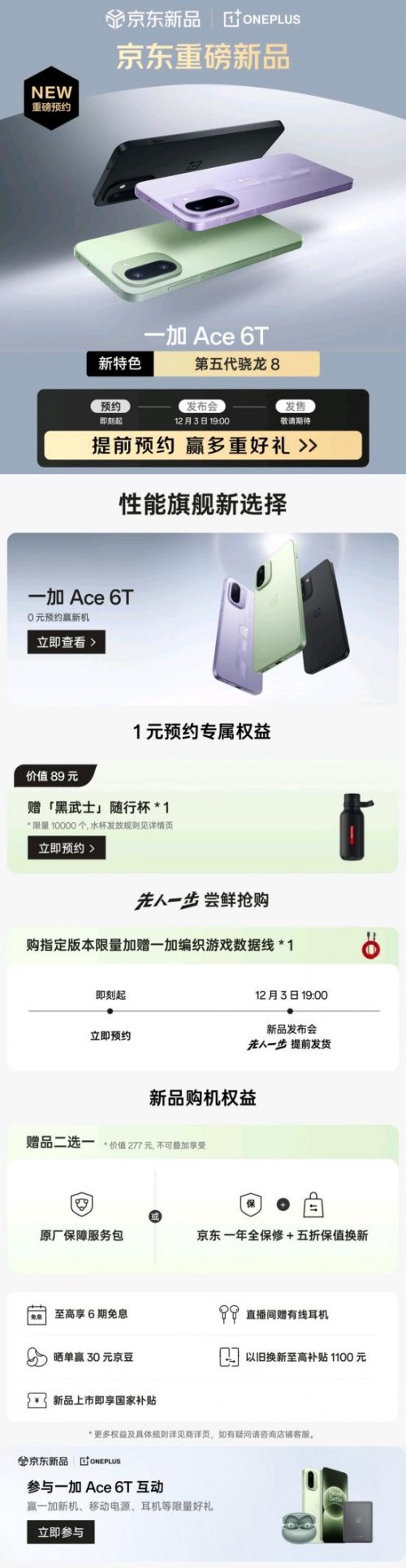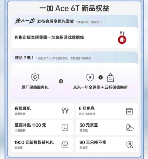 12月3日,一加 Ace 6T将正式发布。为带给消费者更多权益,京东携手一加打造先人一步加速换新计划,提供限量新品现货优先发货,最快发布会后半小时送达,购指定产品限量赠一加编织游戏数据线。来京东下单一加 Ace 6T还可享限量权益随心选,包括原厂保障服务包、京东一年全保修+五折保值换新,两项权益可任选一项。即日起,消费者可到京东APP搜索“一加先上岸”进入活动页面预约新机,方便发布会后第一时间下单。