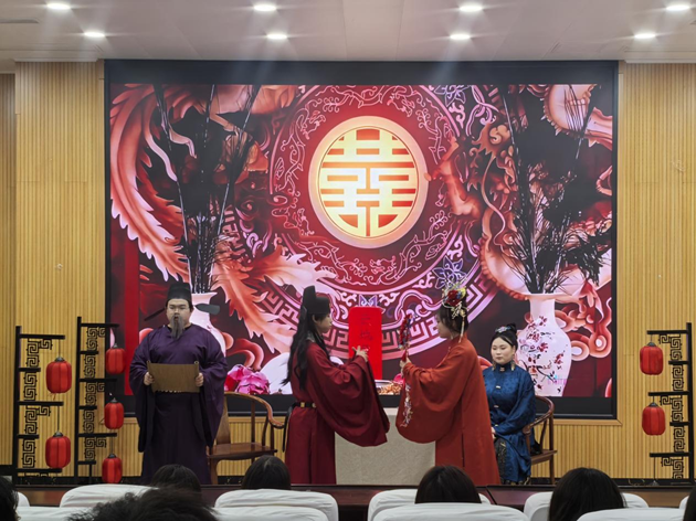 团队原创情景剧《明代药饰情缘》讲述了两位年轻人对非遗从陌生到热爱,最终主动加入传承行列的故事,生动诠释了“匠心传承・非遗焕新”的活动主题,引发了同学们的强烈共鸣。展演现场内座无虚席,同学们认真地观看着团队成员生动演绎的情景剧,跟着剧情了解到一项又一项的非遗技艺。