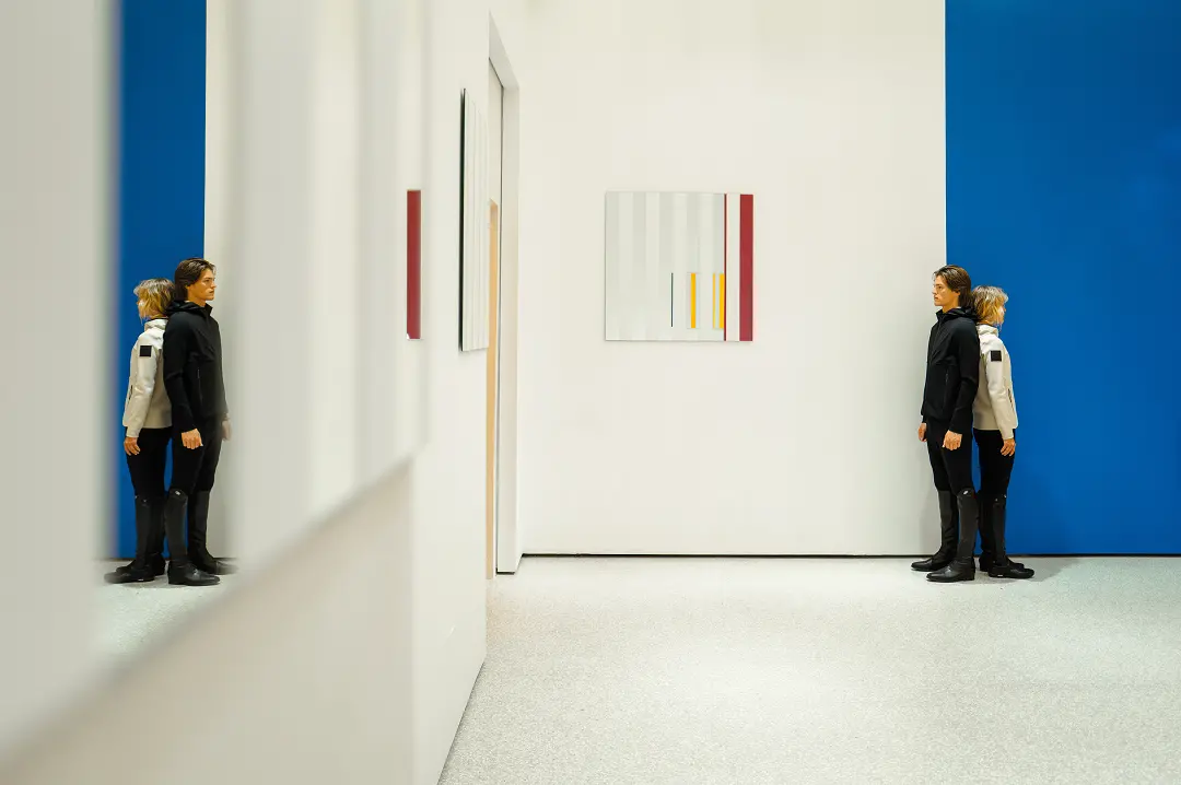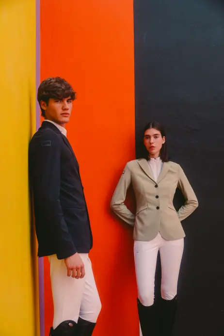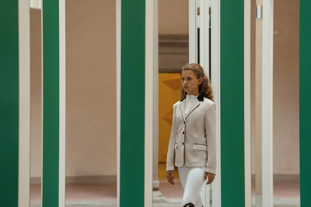 该系列探索了马术传统与当代艺术语言之间的精妙平衡。条纹、色彩构成与简约的建筑感线条,共同构筑了服装的设计语言,旨在延续Cavalleria Toscana 标志性优雅气质的同时,亦提升穿着者的动作延展性、强化成衣的结构感与专业技术表现。置身于极具影响力的法国当代概念艺术家Daniel Buren(丹尼尔·布伦)的经典作品之中,2026春夏系列彰显出鲜明的视觉特质,剪影与空间、光线、托斯卡纳风光相互交融,彼此呼应,在服饰、艺术与环境之间,缔造出充满活力的共生关系。